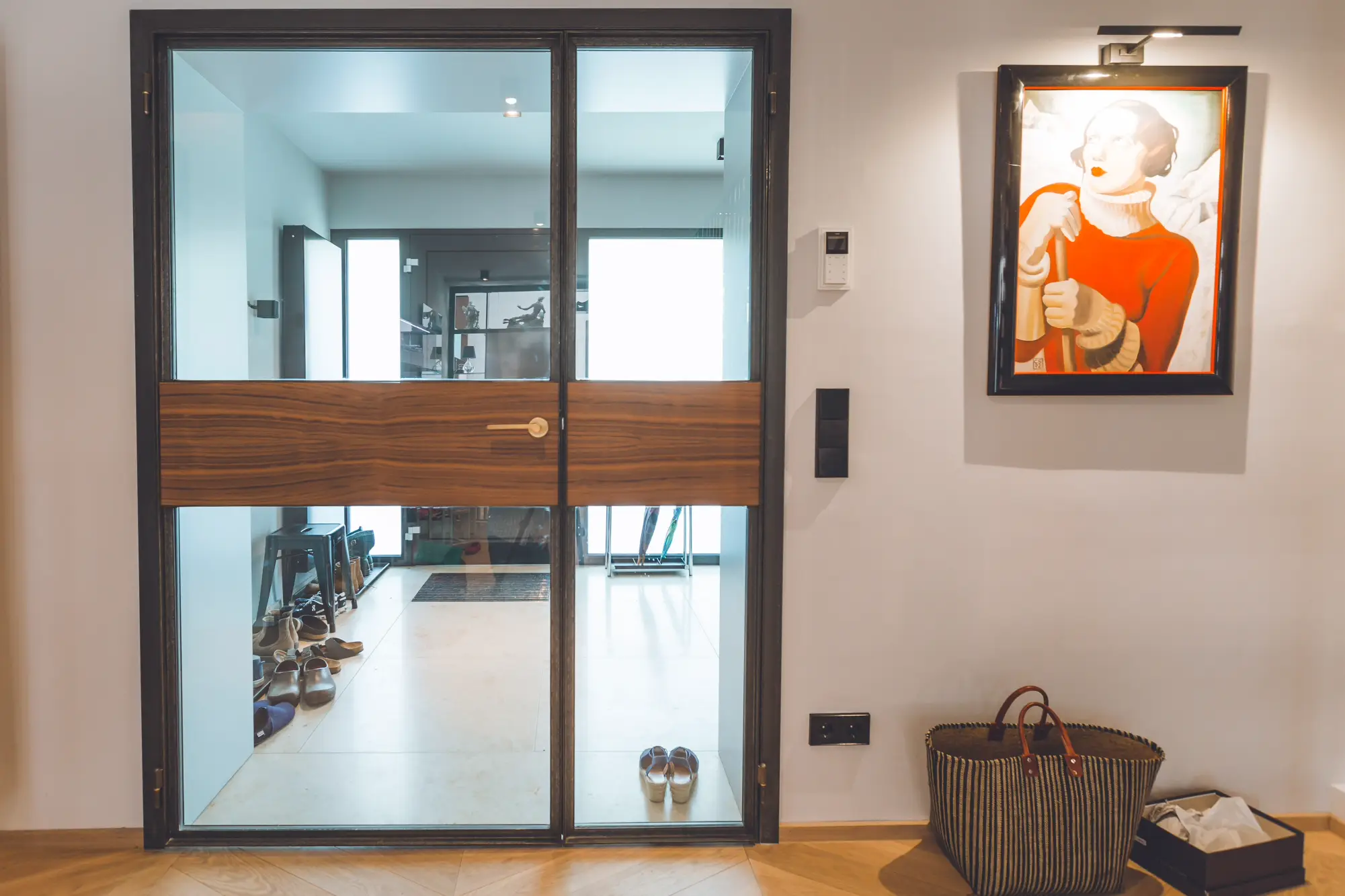 Elegante Stahlglastüren, die Räume stilvoll trennen und gleichzeitig Lichtdurchlässigkeit gewährleisten.